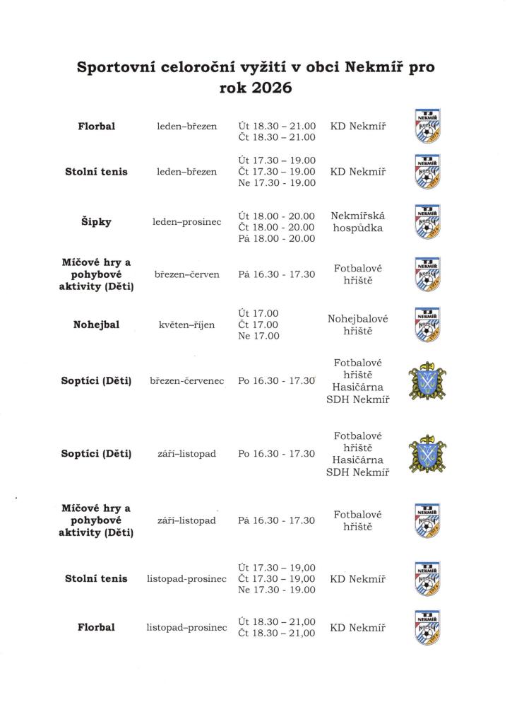 Sportovní vyžití v obci Nekmíř pro rok 2026
